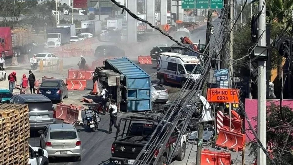 De acuerdo con el reporte de Protección Civil de Apodaca, el percance se registró alrededor de las 11:36 horas, cuando un tráiler con una tolva cargada de chatarra perdió el control a la altura del cruce con Avenida del Teléfono. Debido al exceso de velocidad, el remolque se desprendió, derribó las barreras de contención de las obras del Metro e invadió el carril contrario.